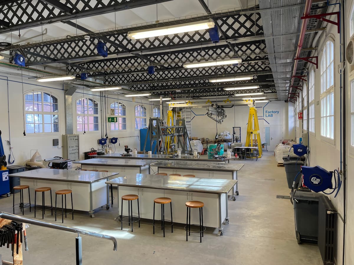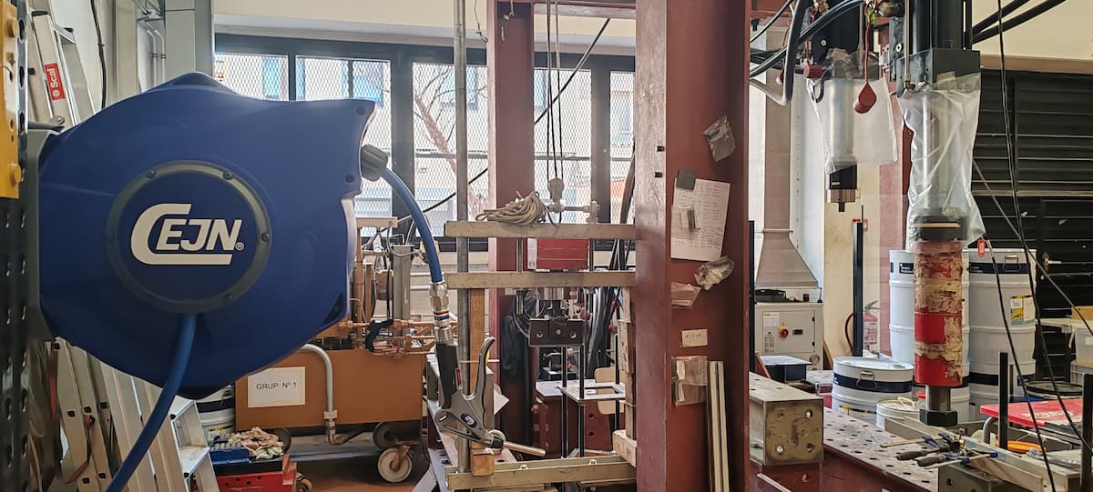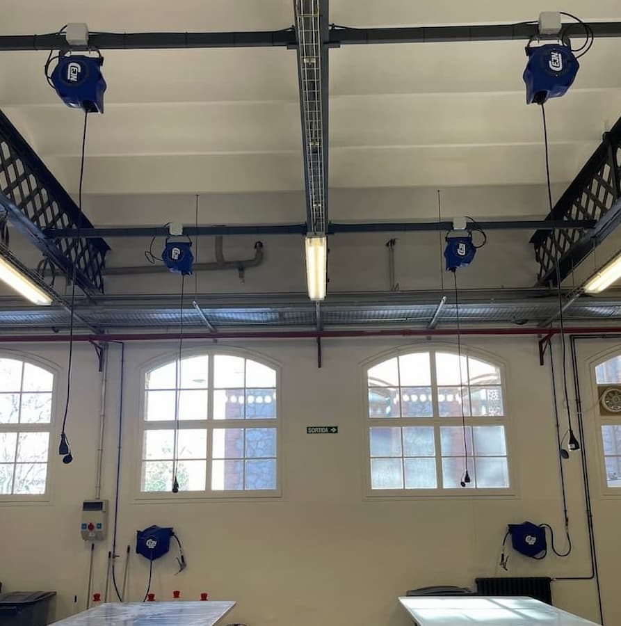 La primera parte del equipamiento ya ha sido instalado en el Factory Lab, donde se realizan ensayos de materiales. La sala ha sido equipada con diversos enrolladores de cable de retracción controlada que ayudan a la modularidad del espacio, y varios enrolladores de aire comprimido y agua con pistolas MultiFlow de caudal regulable.