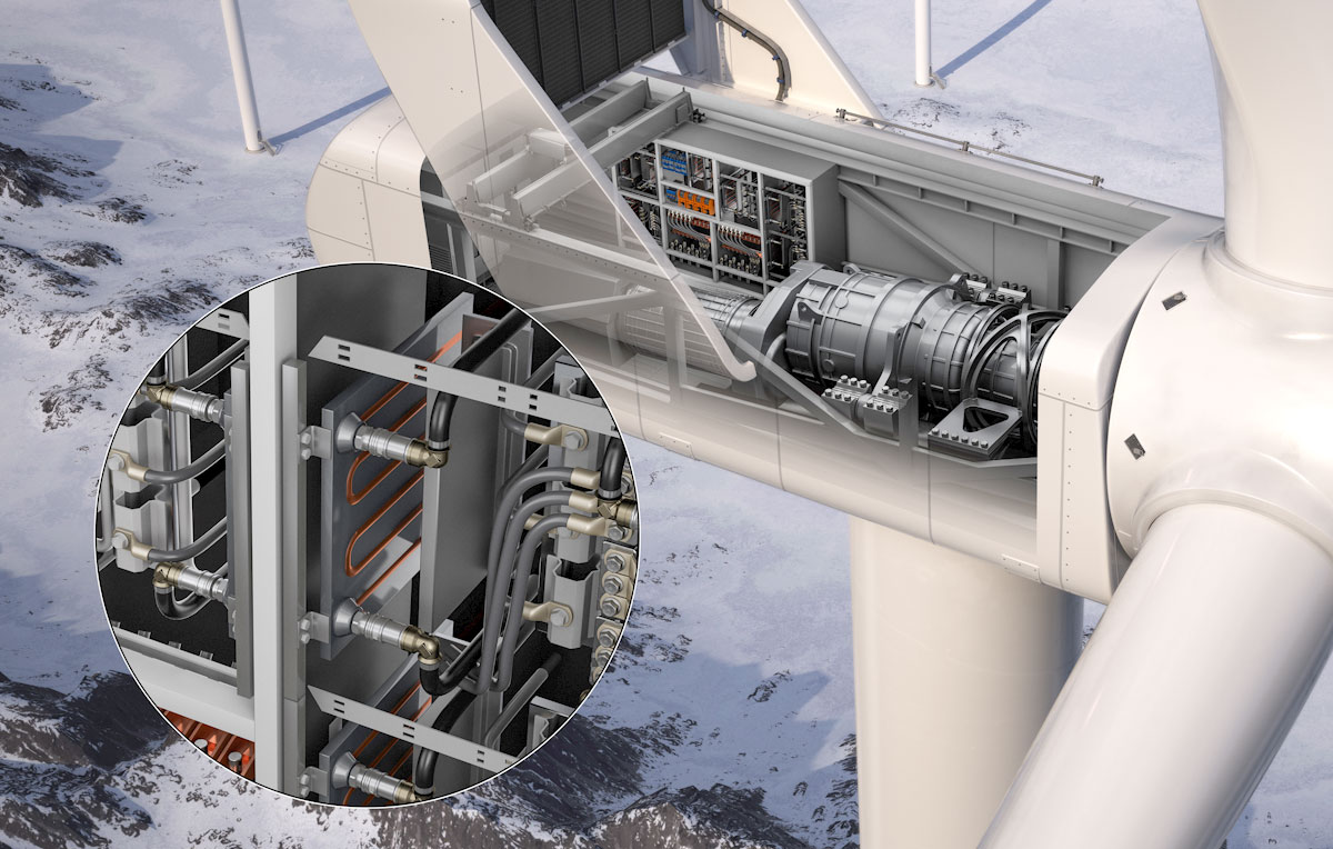 随着风力涡轮机变大以增加功率输出,变频器和电子控制系统产生的热量已经超过了传统空气冷却可以管理的范围。 对于最大的风力涡轮机,必须进行液体冷却以将电子设备保持在安全和可操作的温度下。