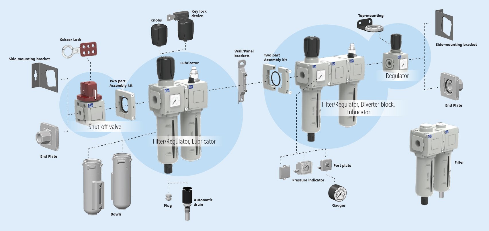 从安全截止阀到过滤器/调节器再到润滑器,所有这些结合起来有许多可能性。 所有产品均配有简易装配夹具和各种安装支架。